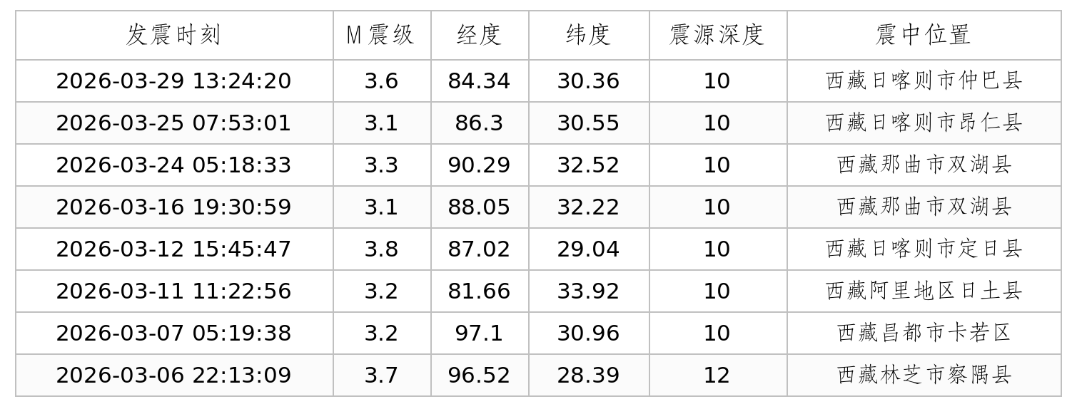 西藏自治区2026年3月份地震活动概况